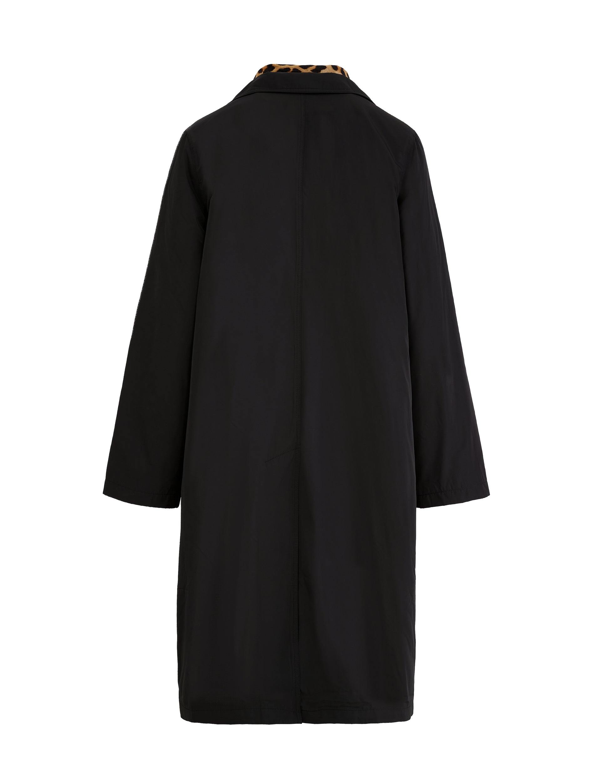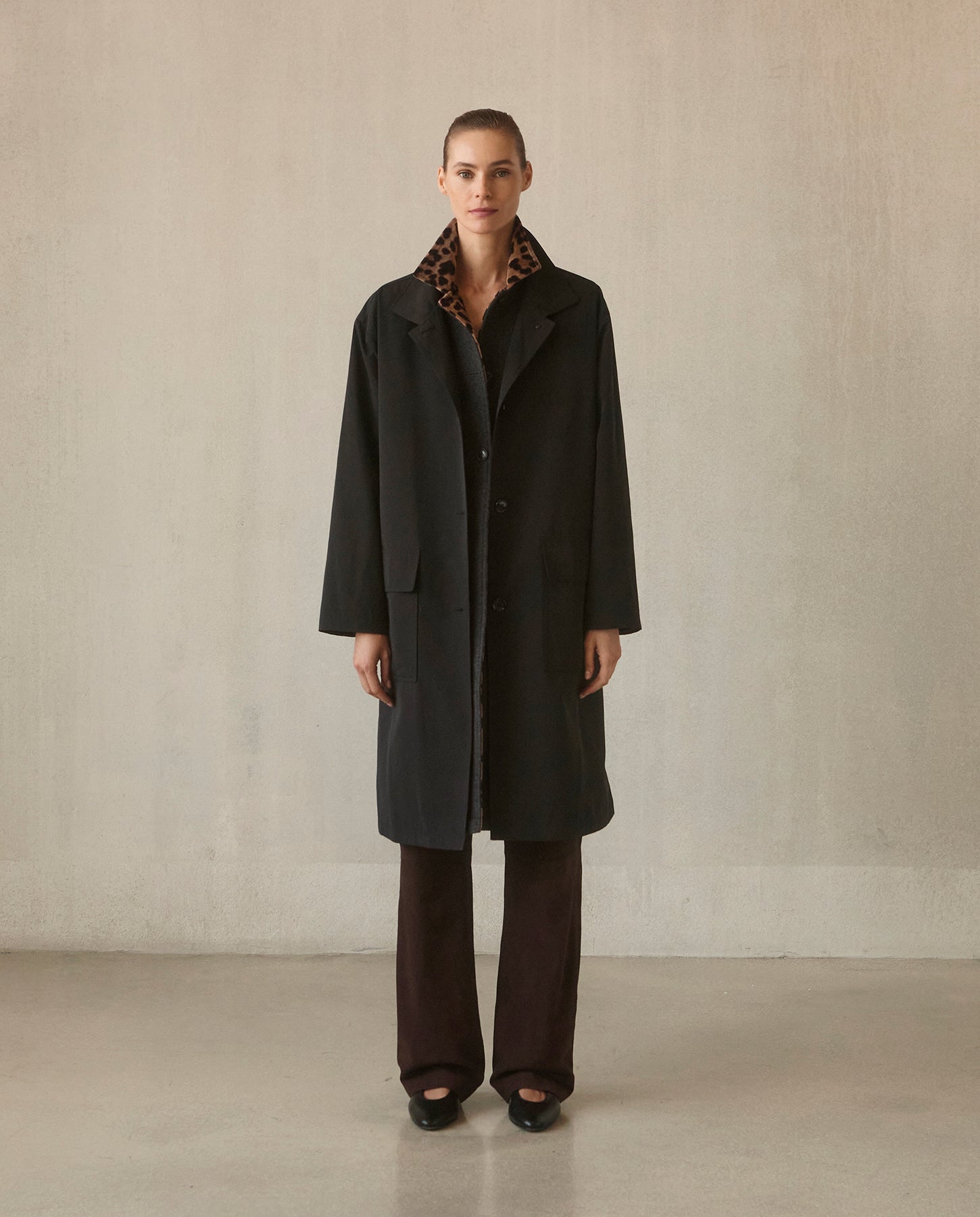 The wool under-coat has a minimalist aesthetic offset with a shot of leopard velvet on the inside collar and front facing, with a small, tidy collar and horn buttons. The rain topper is made of water-resistant nylon and finished with oversize patch pockets and tonal enamel buttons.