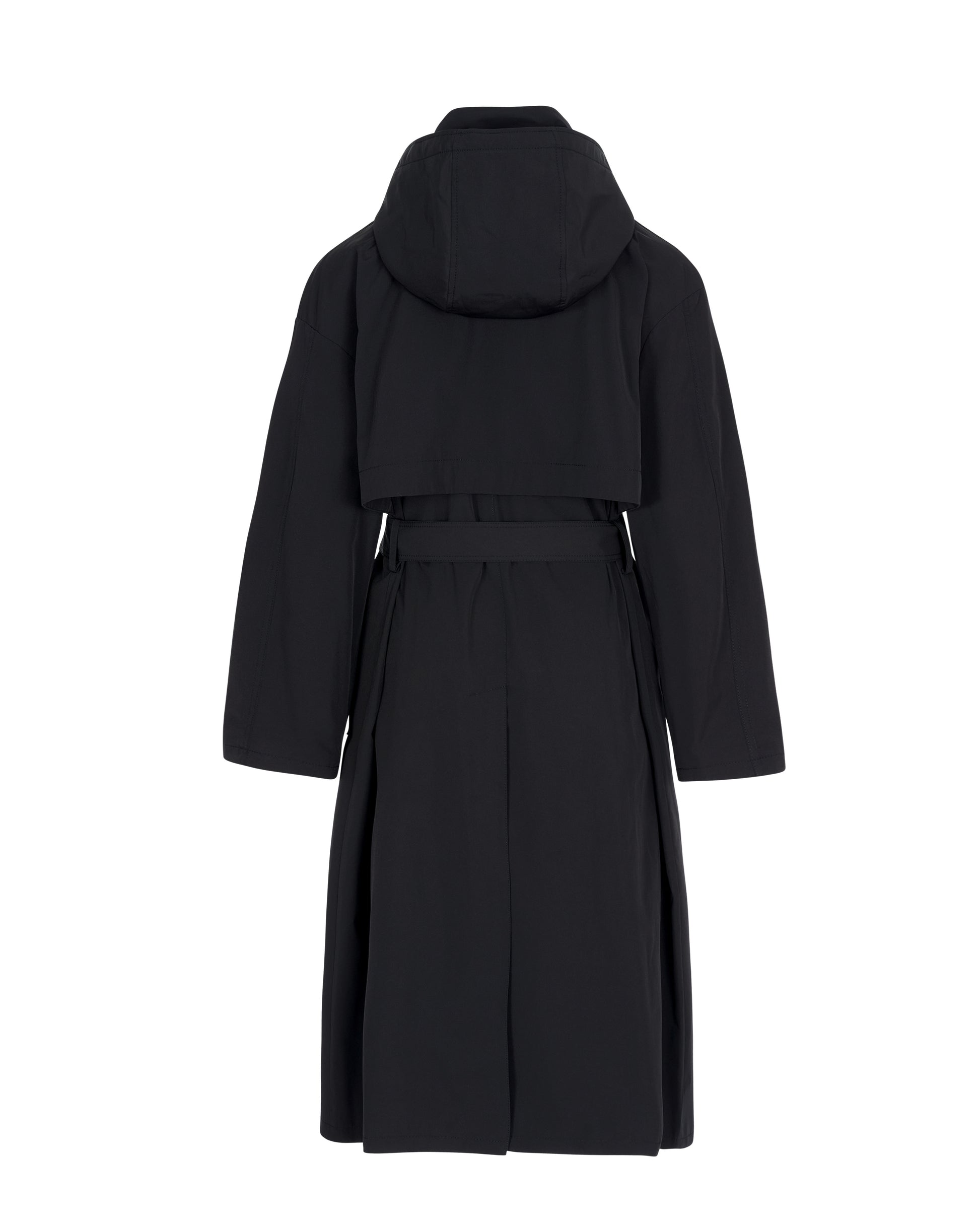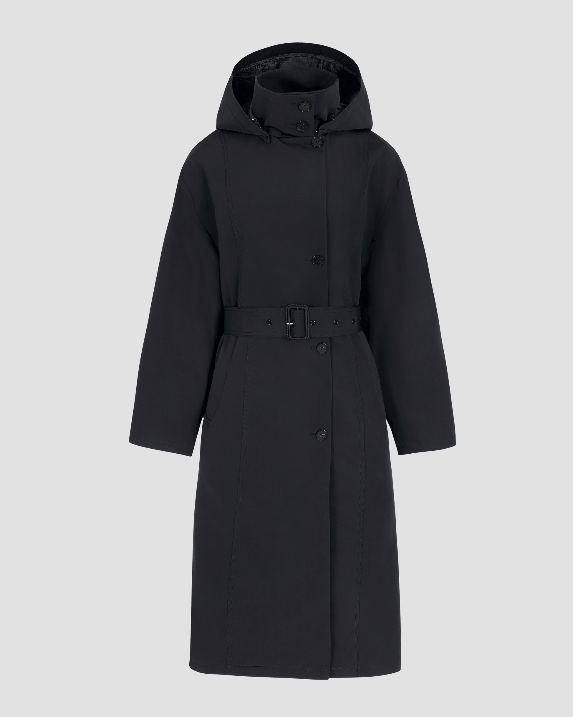 Finished in our water resistant nylon fabric, this elegant coat is fully lined in tonal monogram lining a detachable hood, belted waist with a genuine leather buckle, dark horn buttons deep back yoke and relaxed fitting dropped shoulders