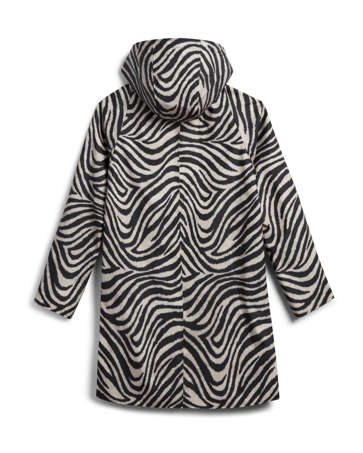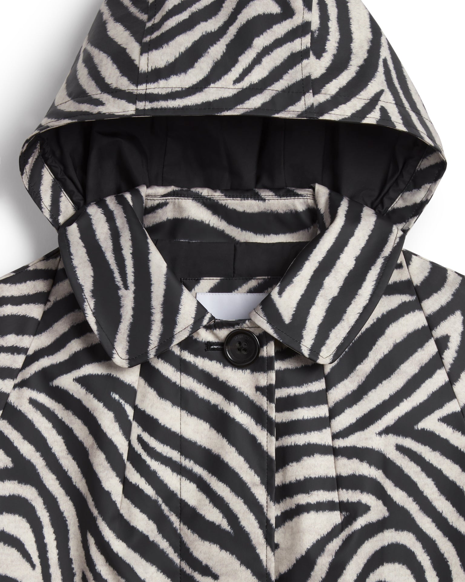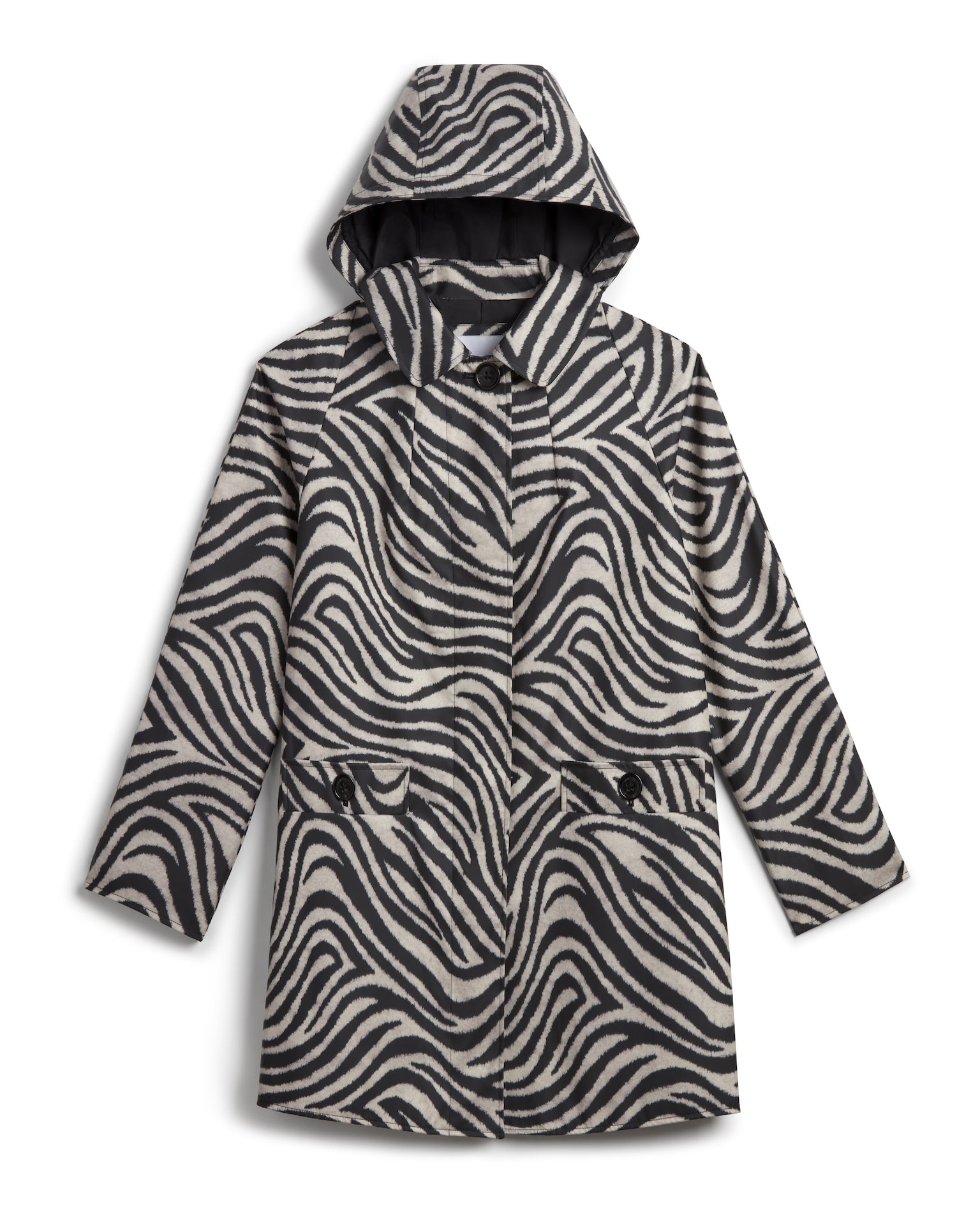 A glamorous water proof coat finished in a stunning zebra print. Just the right length for getting in and out of the front seat, with a slight A-line swing for the moment you step out and need to look perfect.