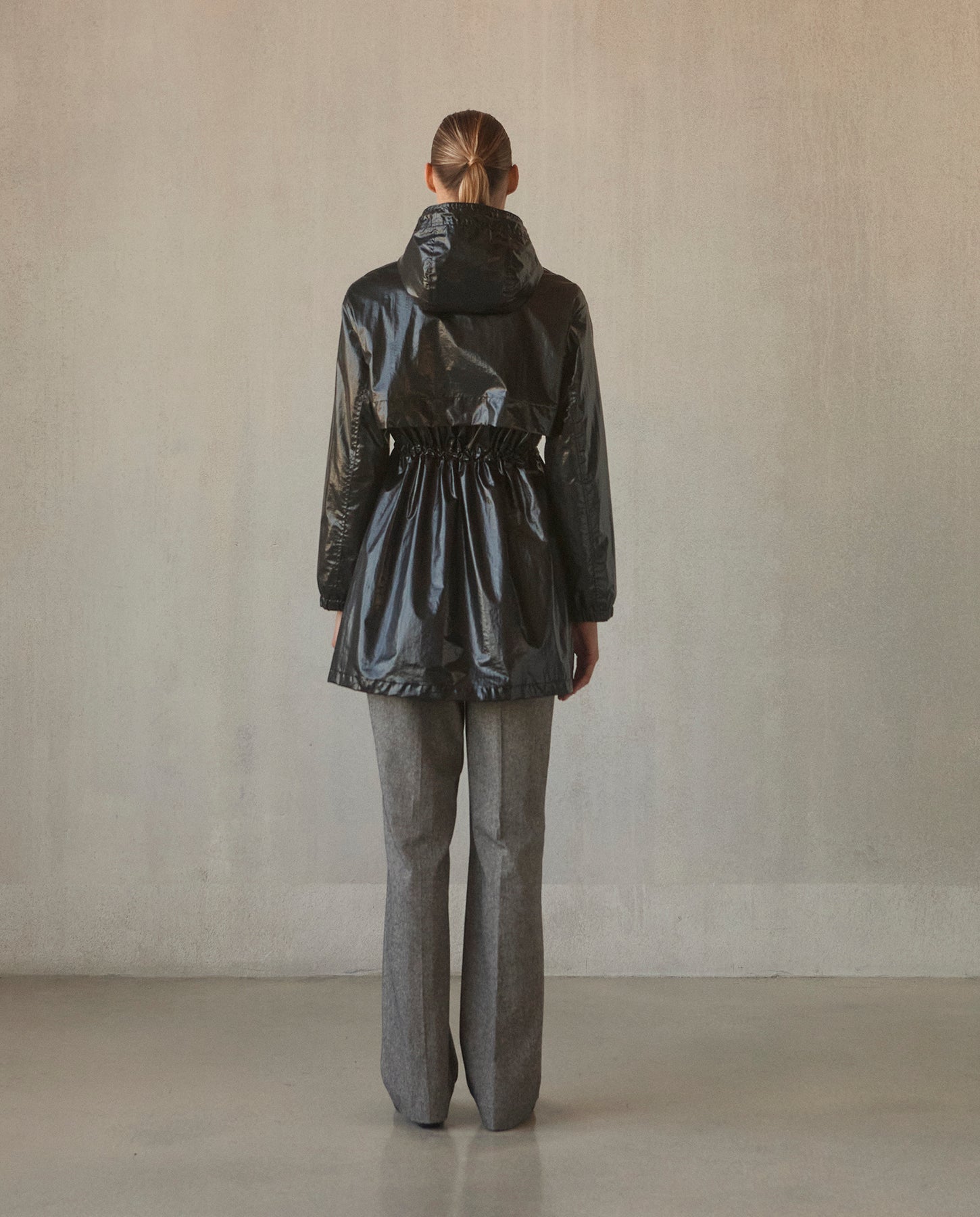 Finished in our matte light slicker fabric, this elegant parka is fully lined in tonal monogram lining and features a fixed hood, cinch waist, enamel buttons and wonderfully large patch pockets. The closure is a 2-way YKK tonal zipper covered by a storm flap and a deep back yoke gives this style a superb silhouette.