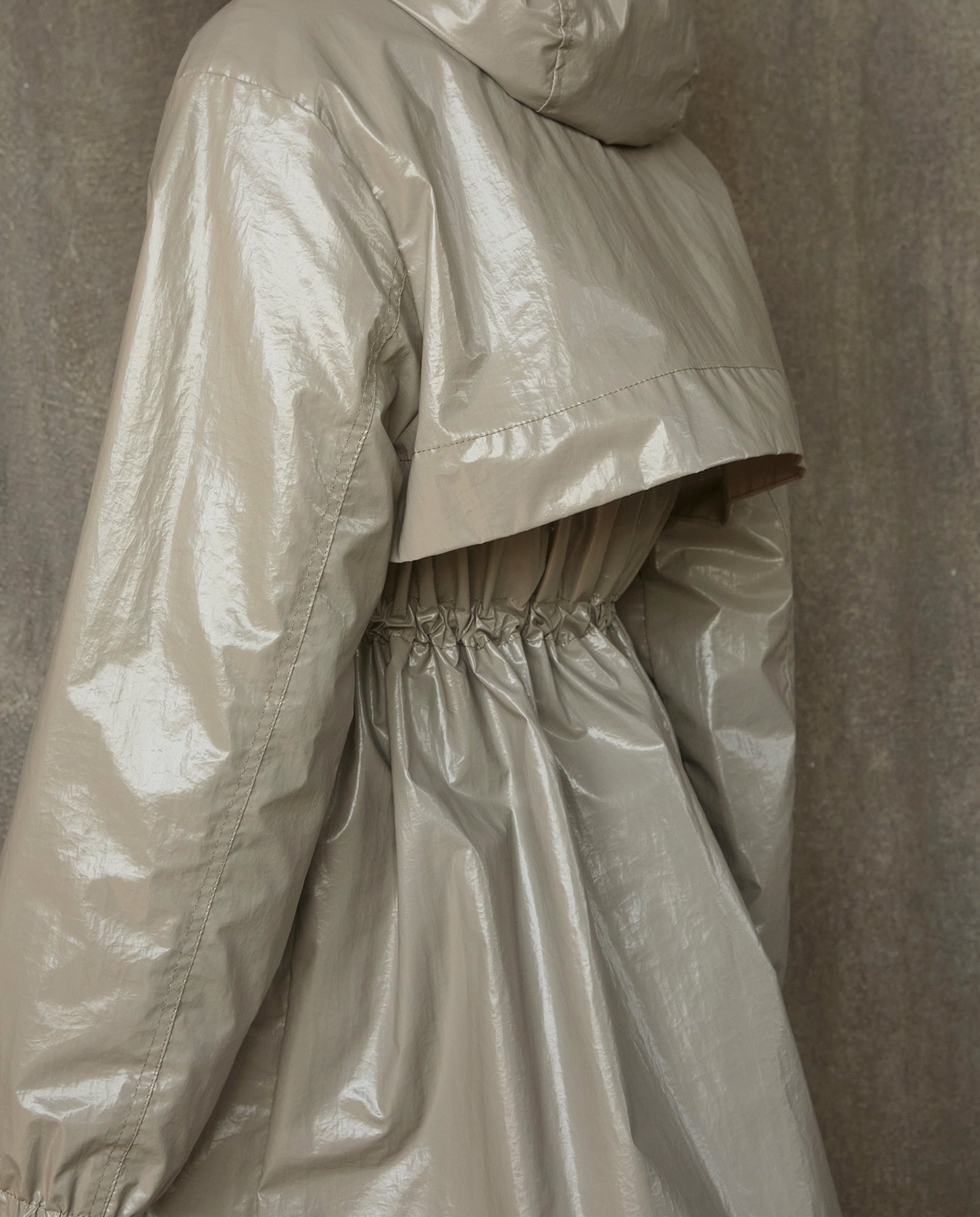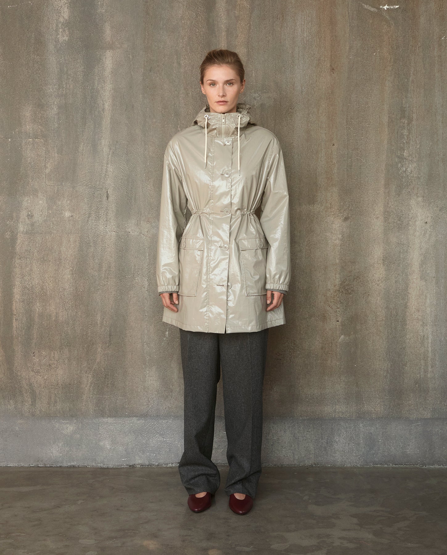 Finished in our matte light slicker fabric, this elegant parka is fully lined in tonal monogram lining and features a fixed hood, cinch waist, enamel buttons and wonderfully large patch pockets. The closure is a 2-way YKK tonal zipper covered by a storm flap and a deep back yoke gives this style a superb silhouette.