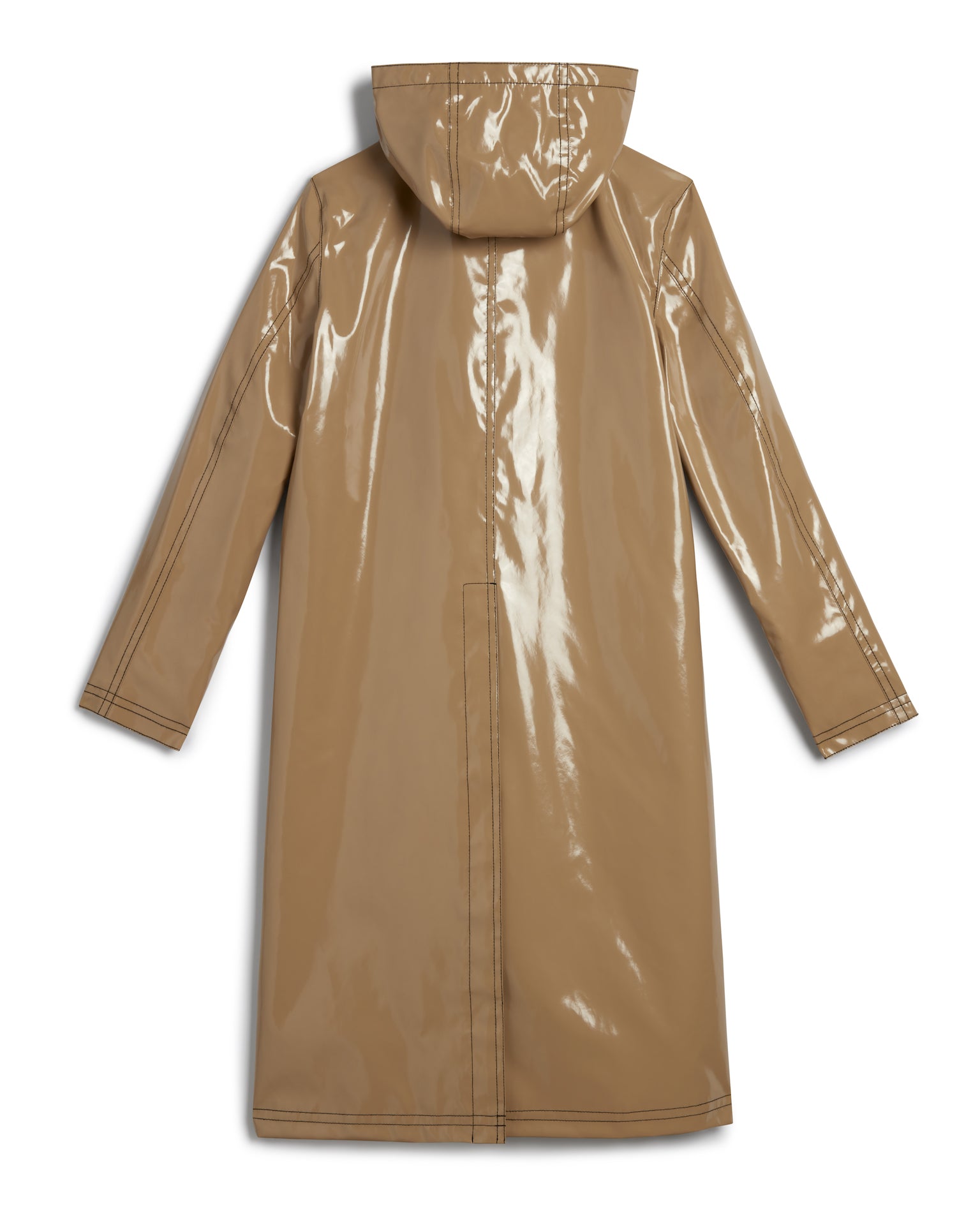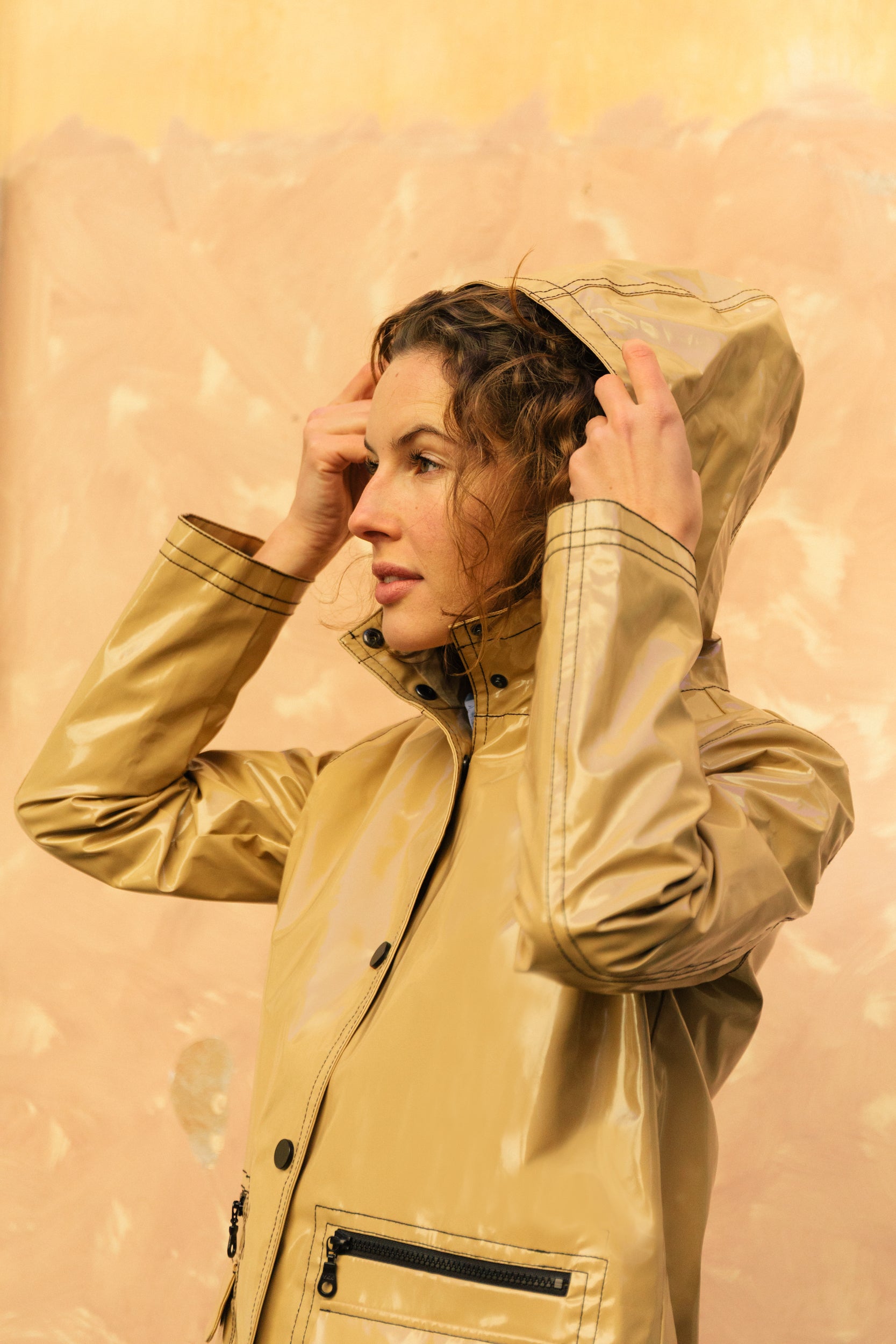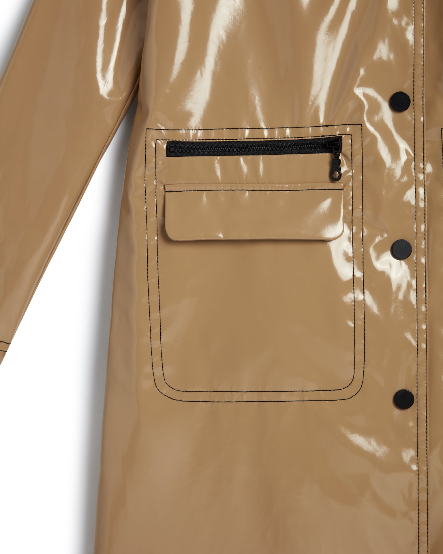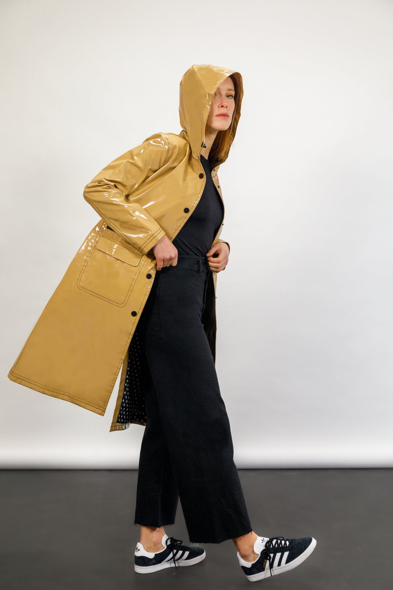 Straight cut, long slicker with contrasting stitching and rubberized snap closure. Featuring polka-dot lining, multiple functional pockets and an adjustable fixed hood.