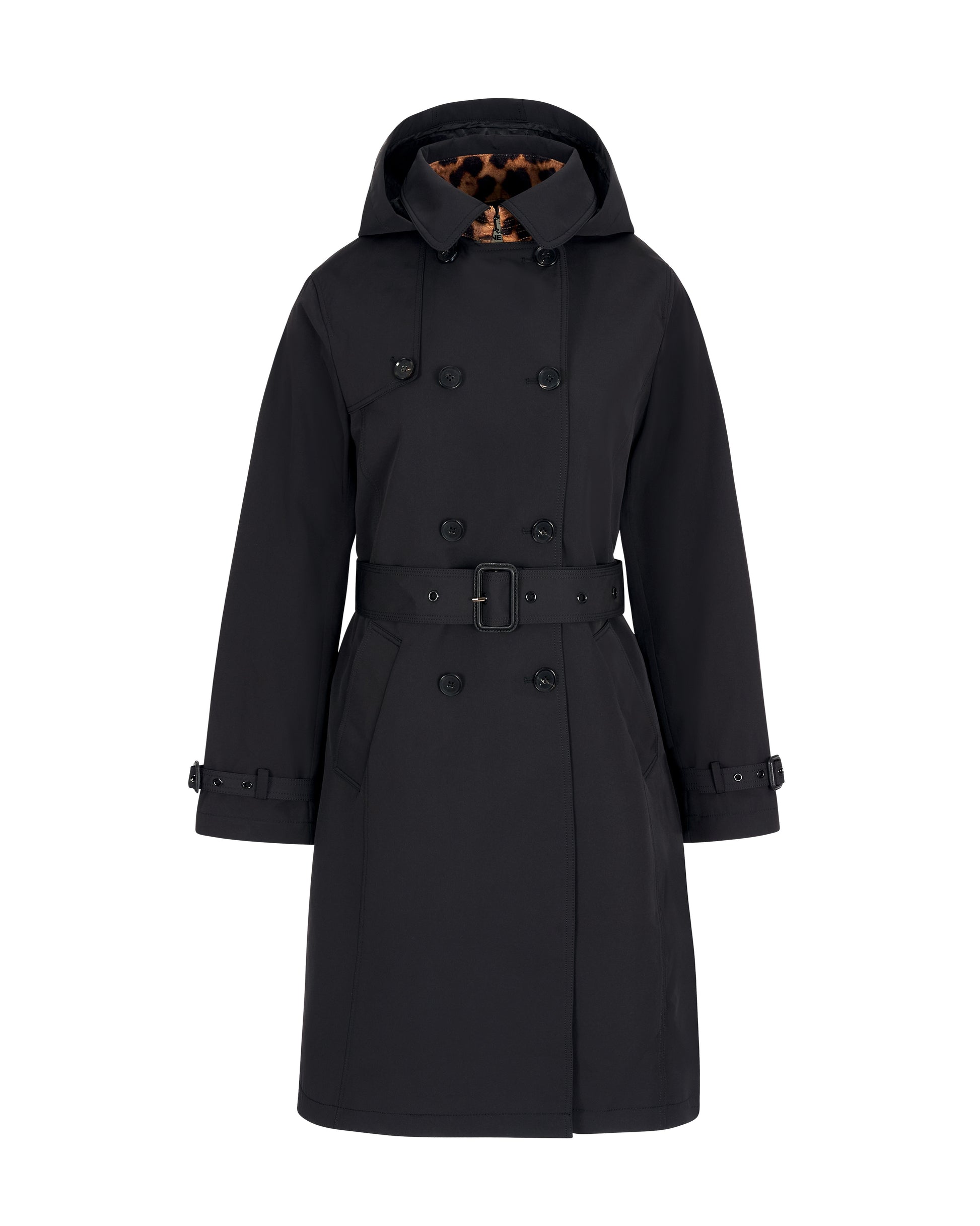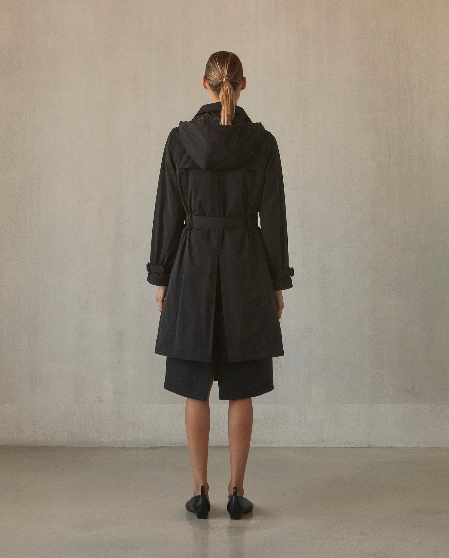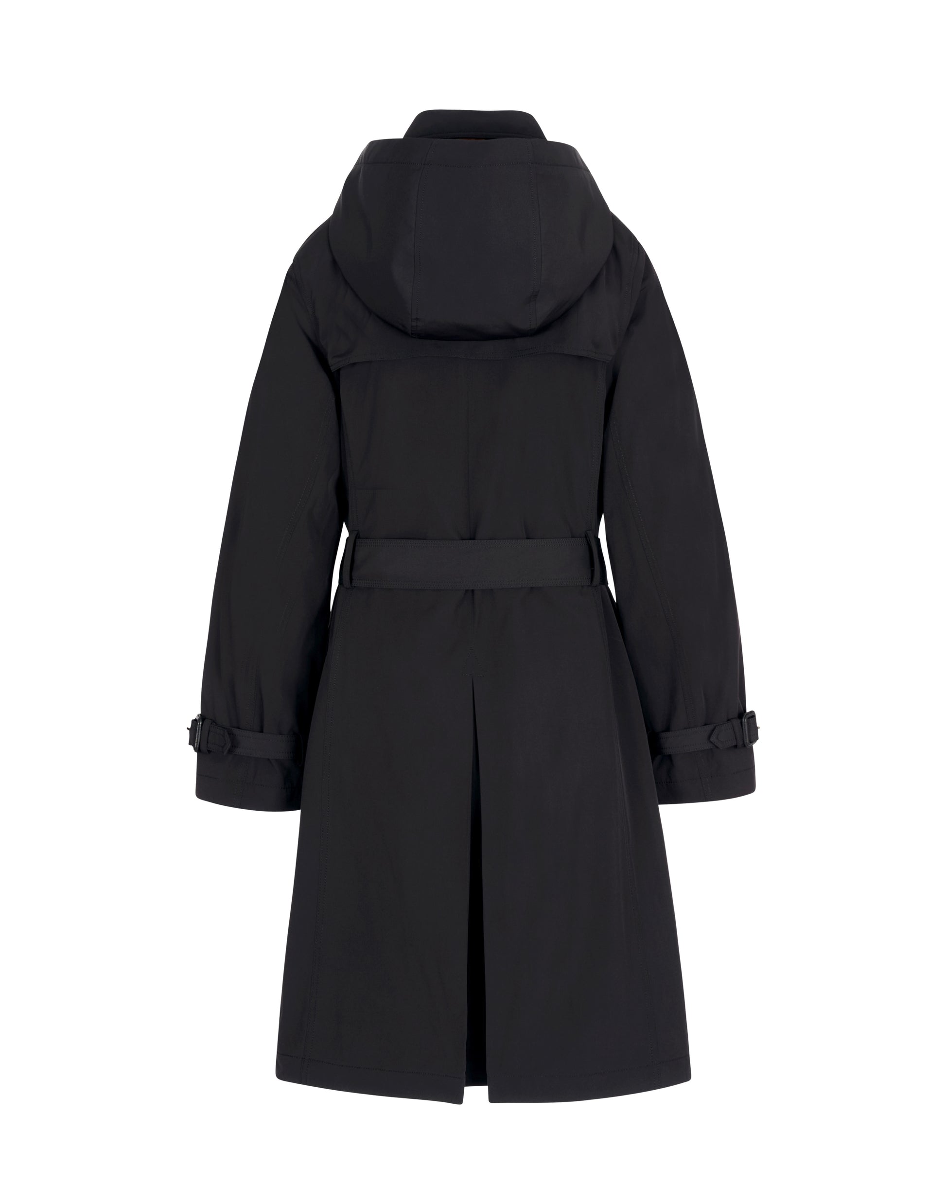 Finished in our water resistant nylon fabric, this elegant coat is fully lined in tonal monogram lining and features a button-out wool liner, detachable hood, belted waist and cuffs with genuine leather buckles, dark horn buttons, back yoke and inverted back pleat at the waist.
