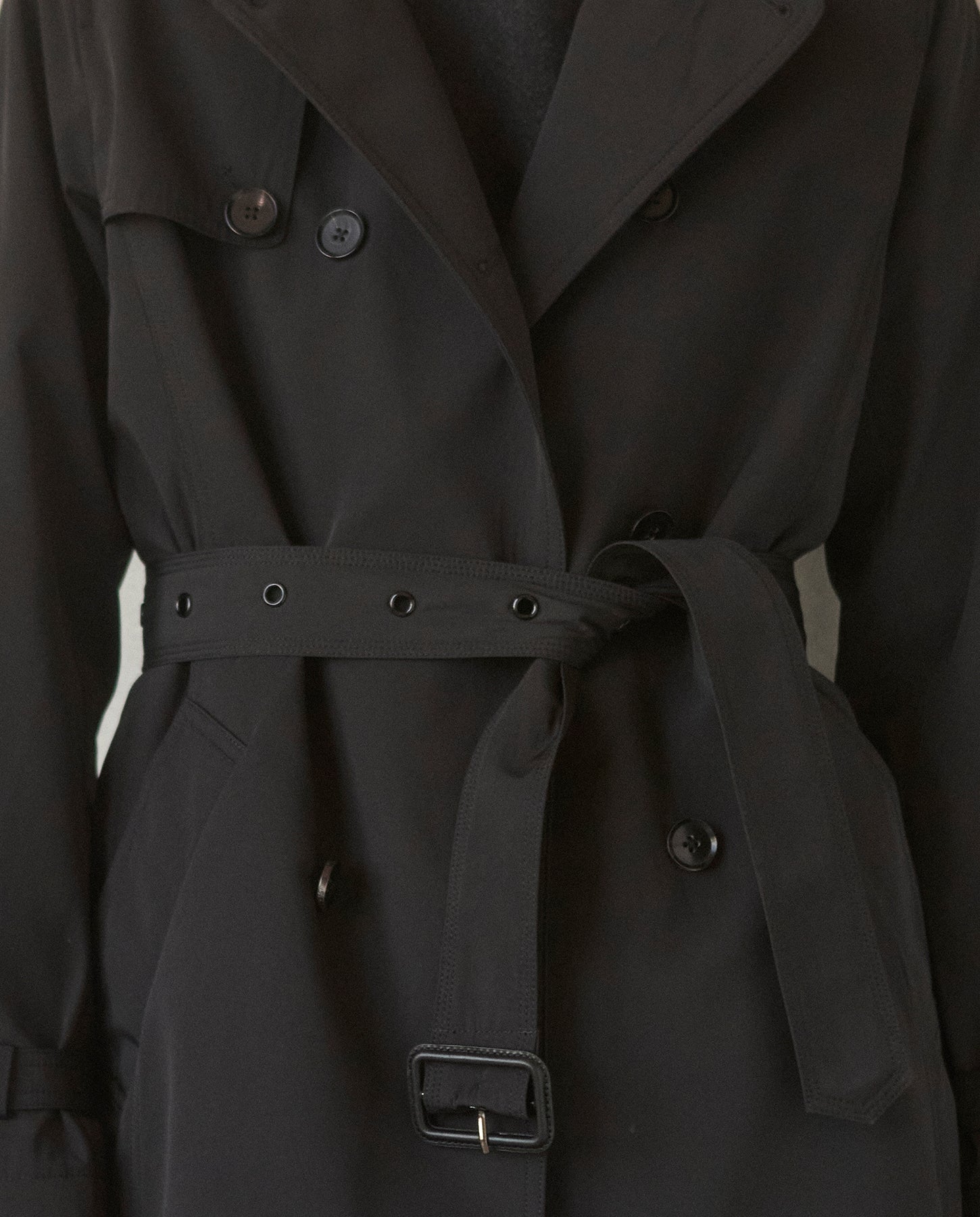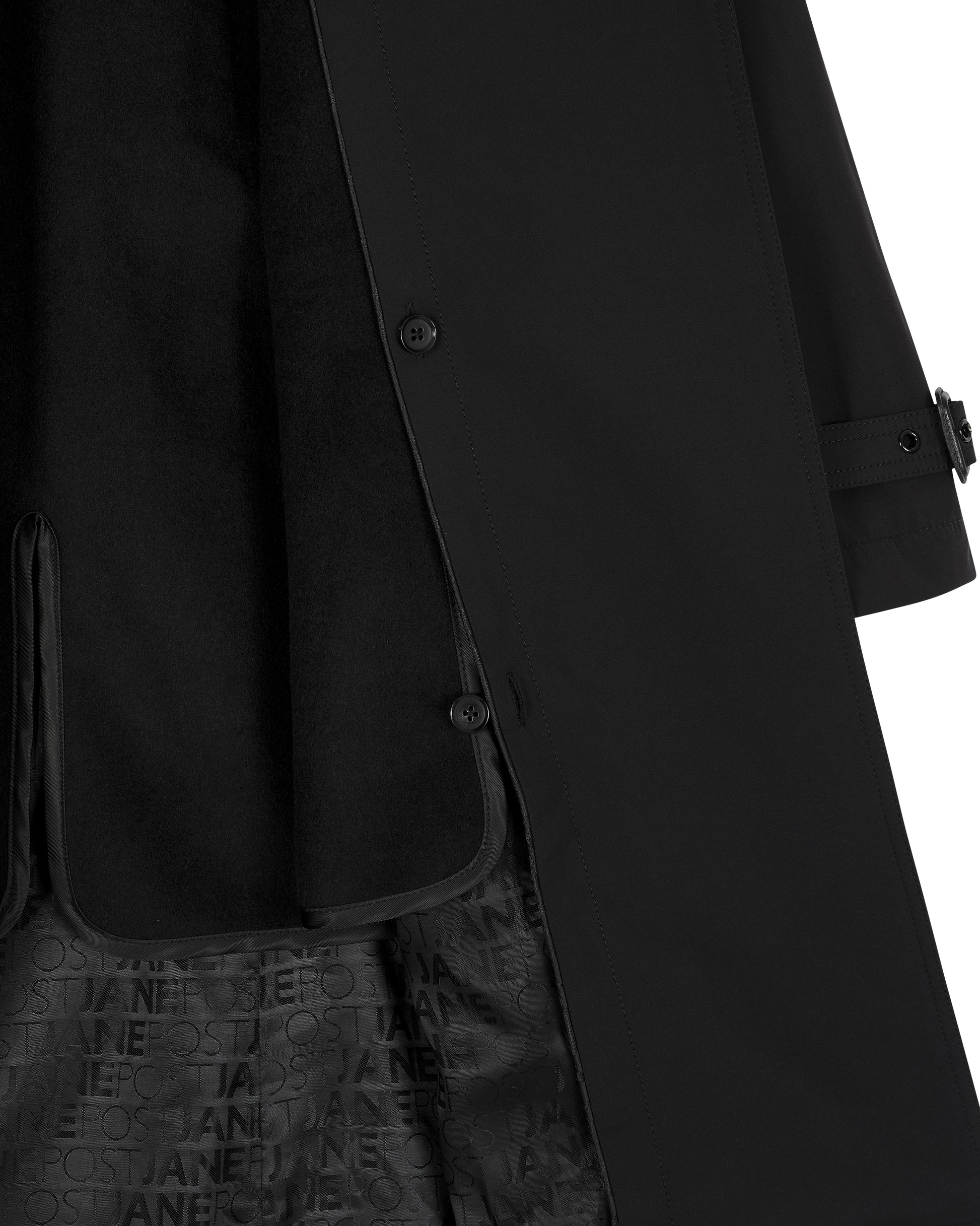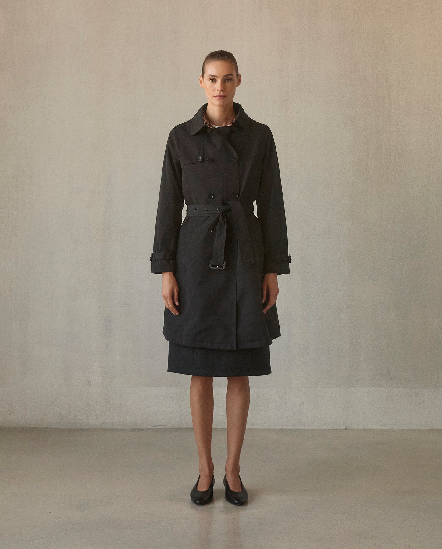 Finished in our water resistant nylon fabric, this elegant coat is fully lined in tonal monogram lining and features a button-out wool liner, detachable hood, belted waist and cuffs with genuine leather buckles, dark horn buttons, back yoke and inverted back pleat at the waist.
