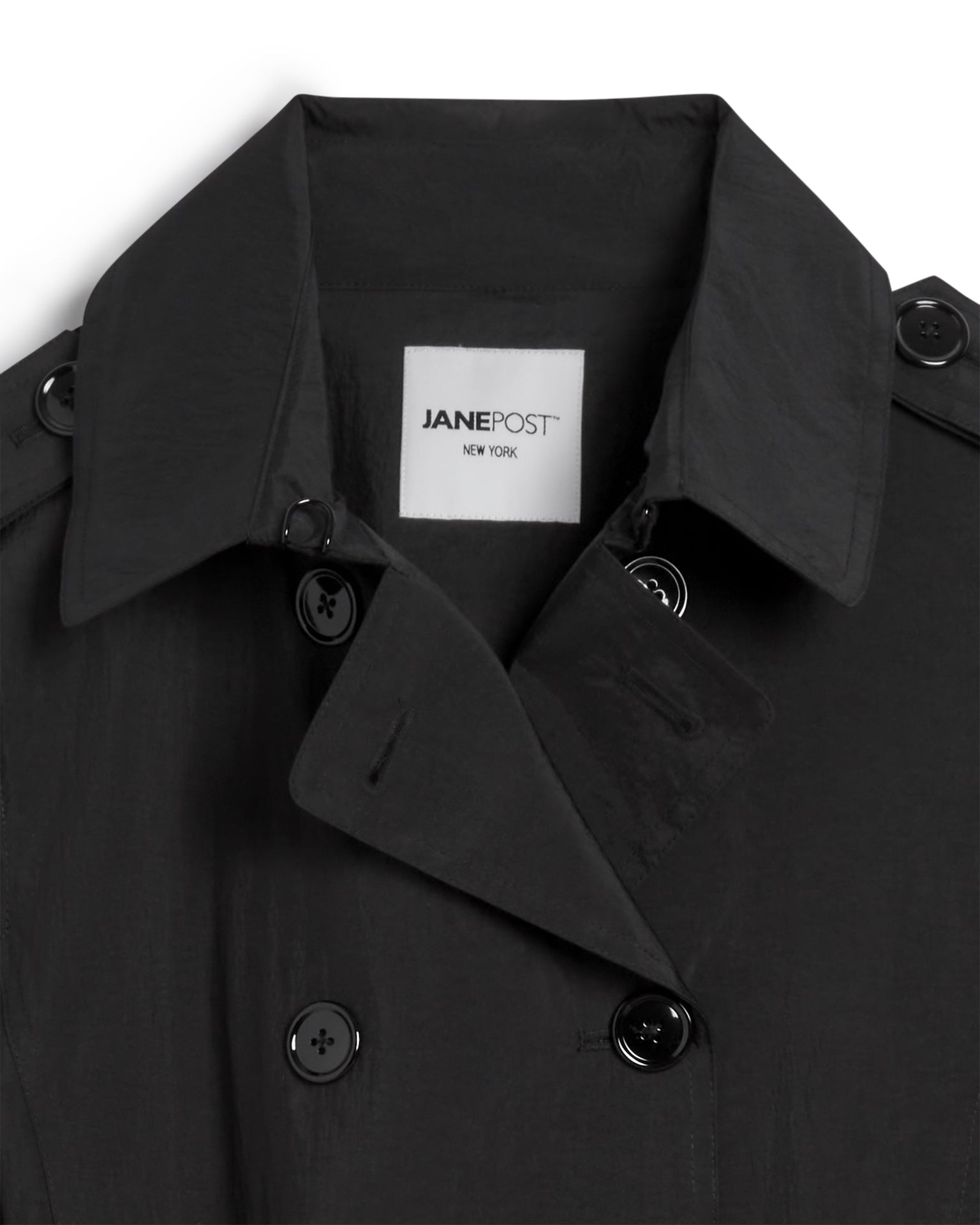 The perfect spring trench finished in Italian crinkly nylon with detachable hood and belt. Military style collar with hook and eye so that the coat can be fully closed in a downpour. Light and packable.