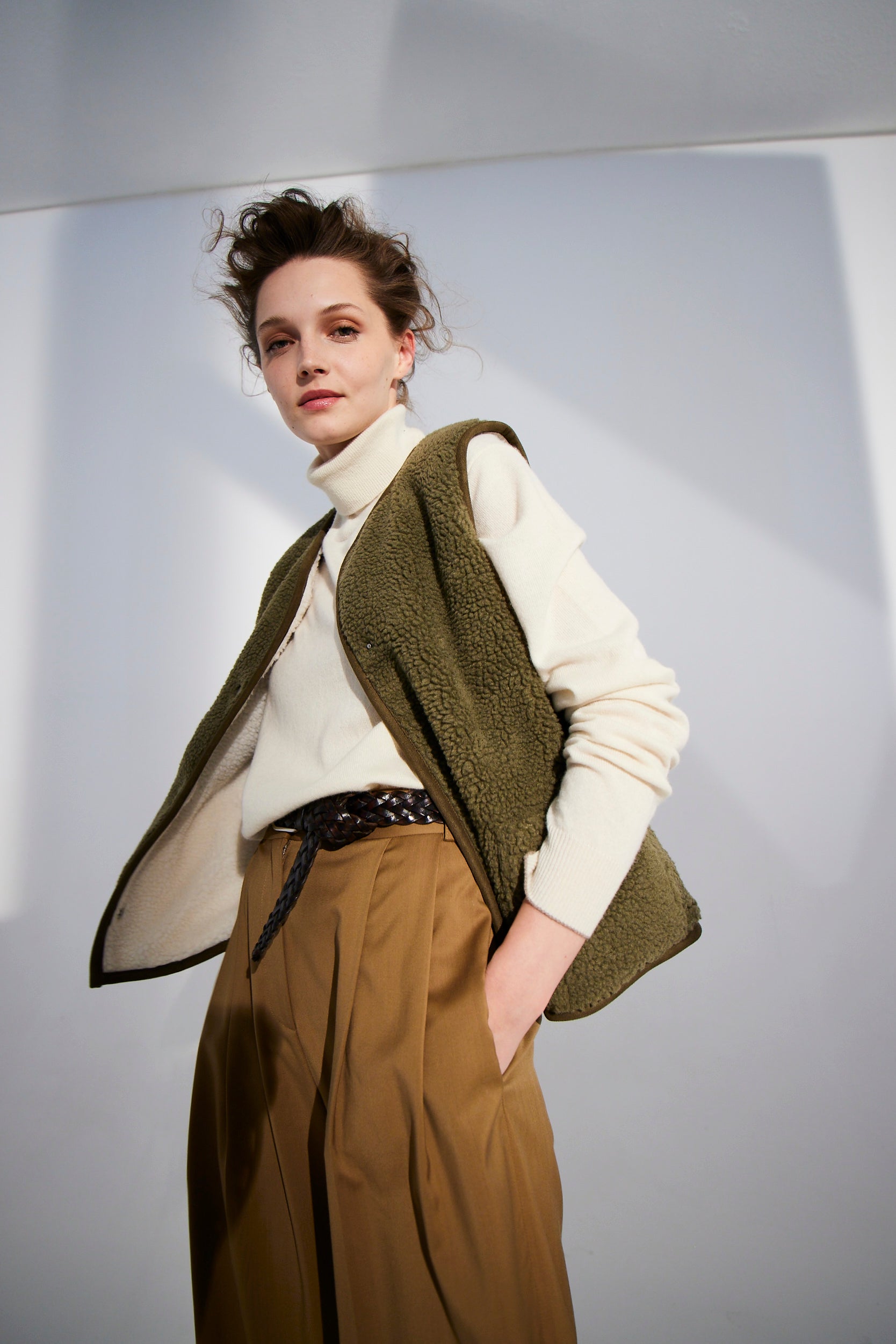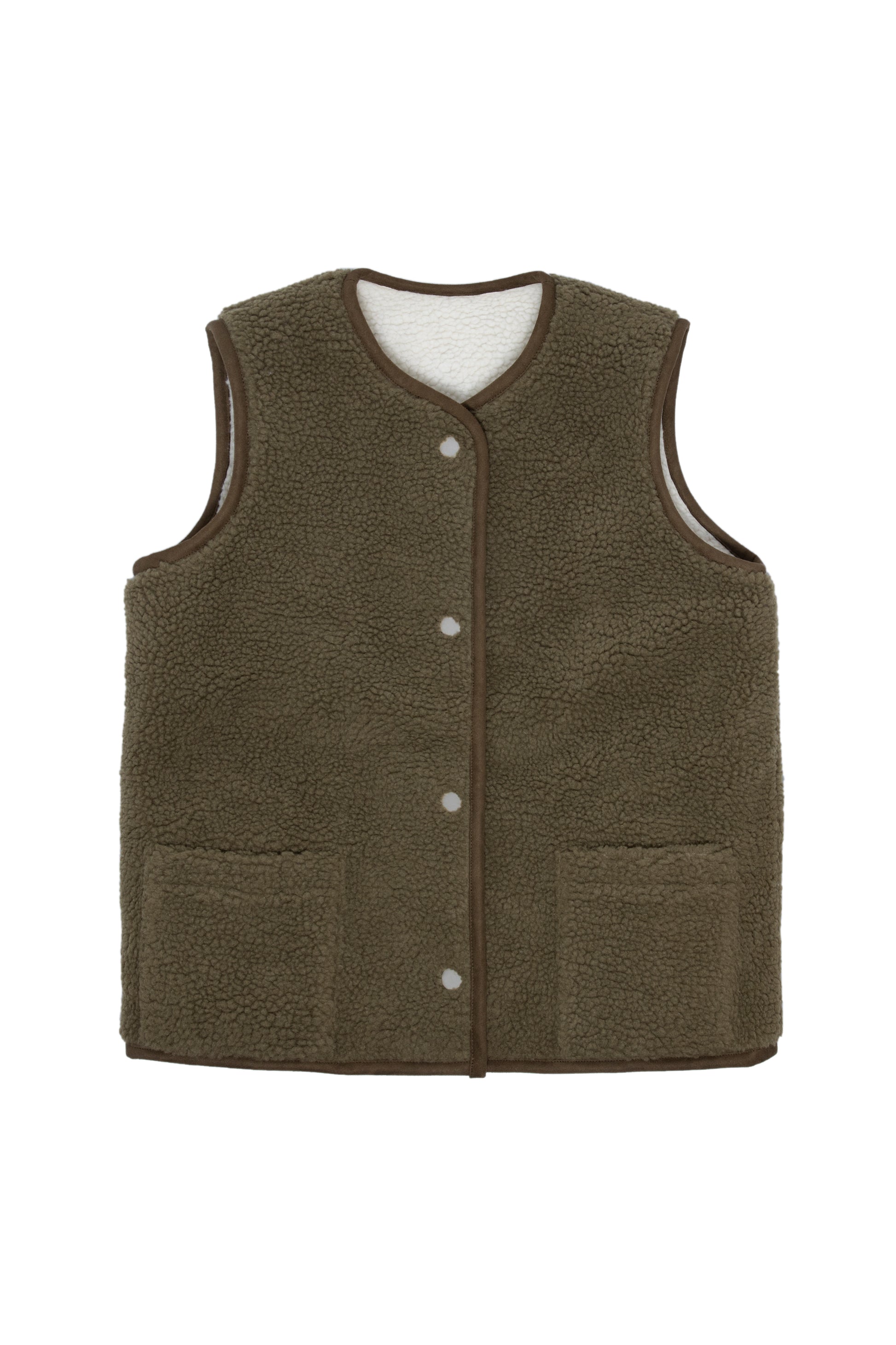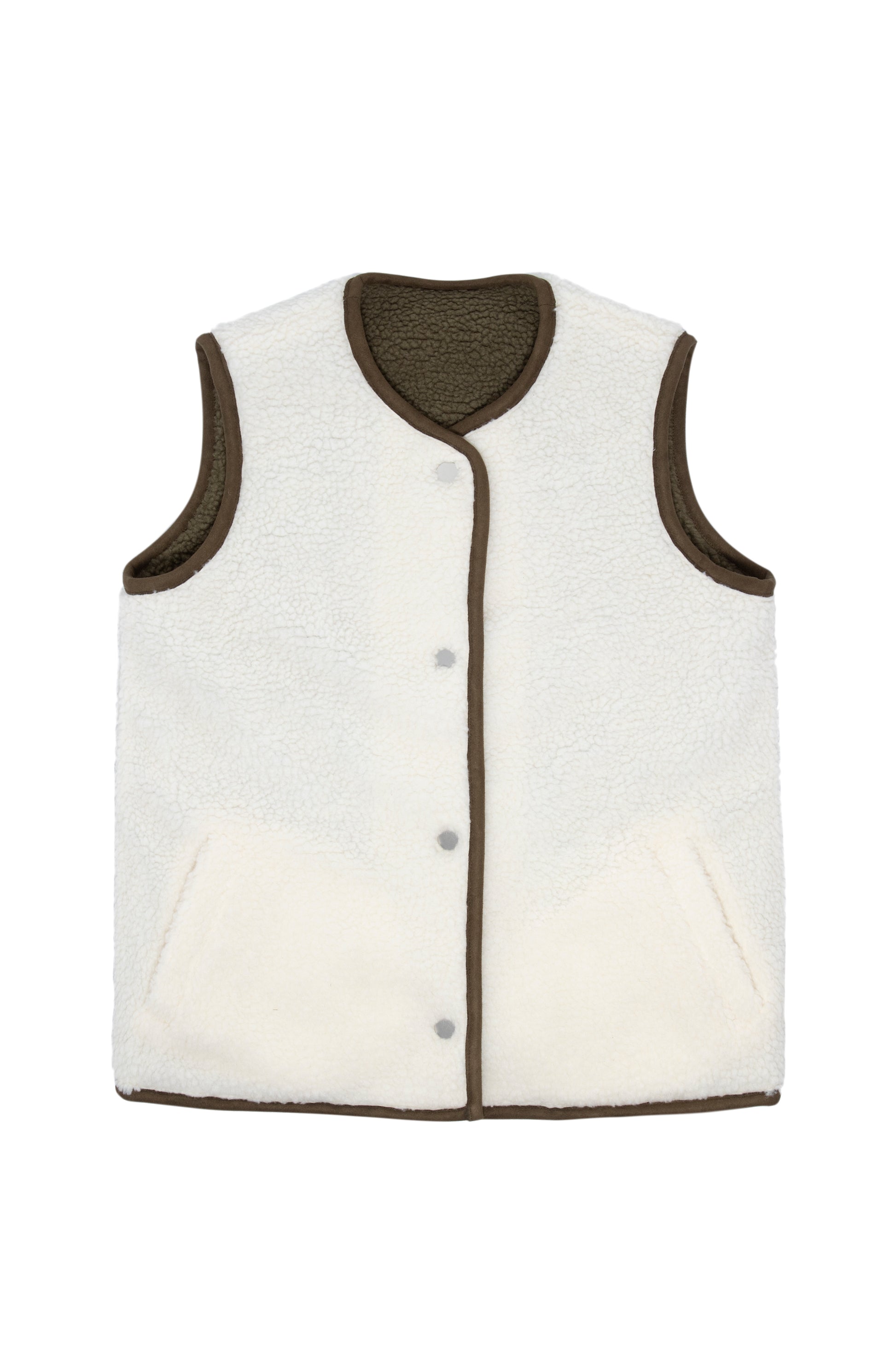 Wonderfully versatile layering piece finished in recycled faux sherpa reversing from one color to another. Can be worn under another coat as a body warmer or simply as a final layer on a fresh fall day. Featuring reversible satin silver snaps.