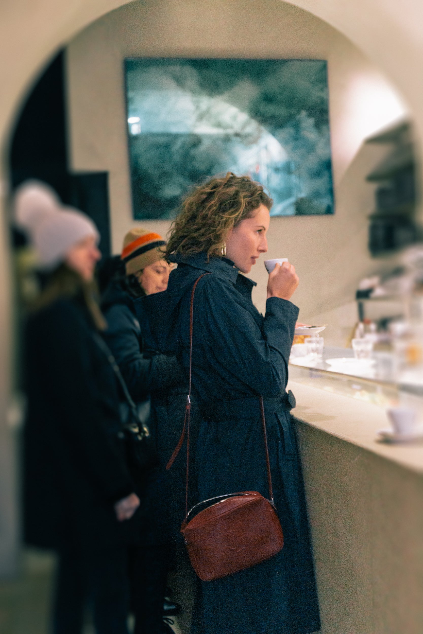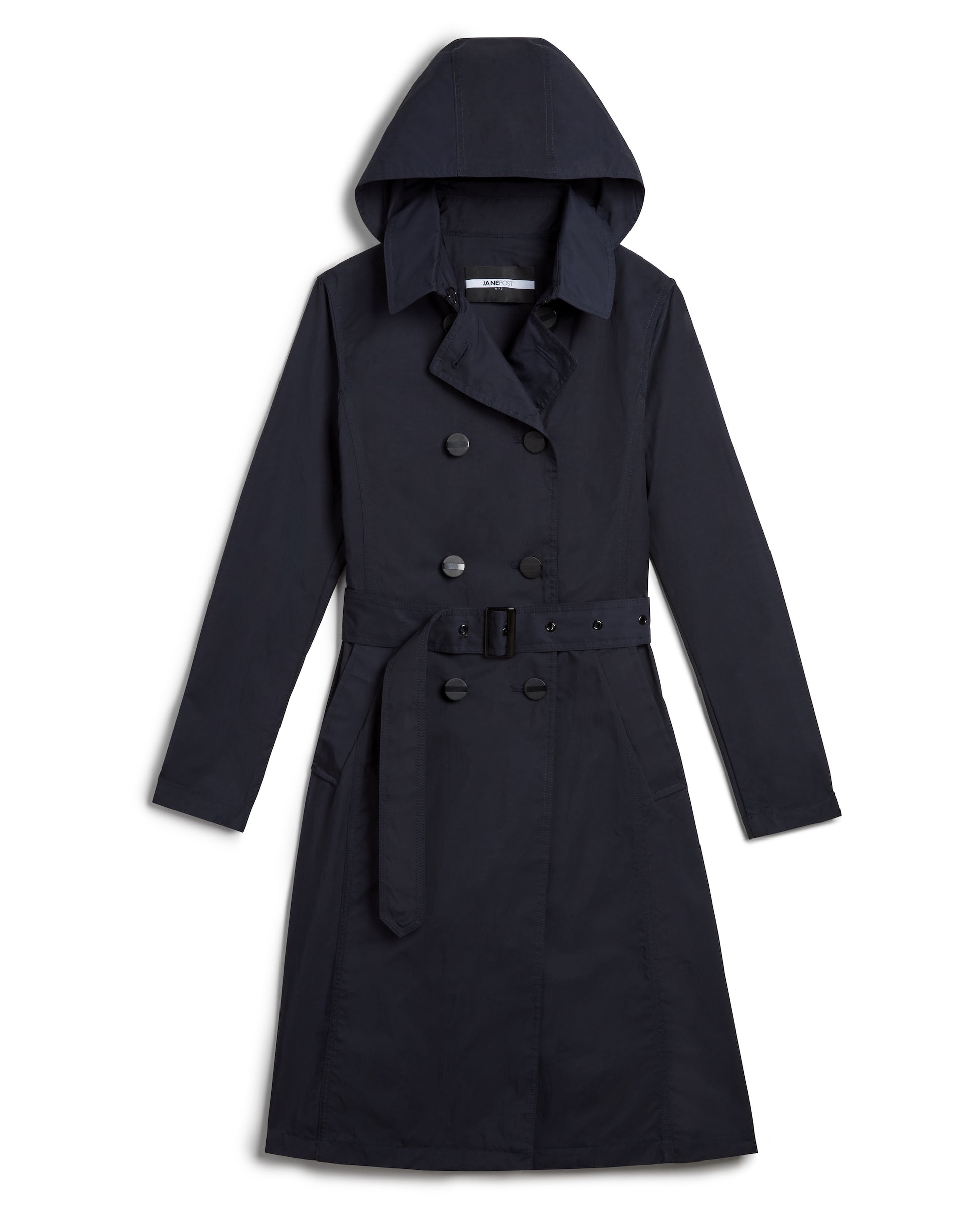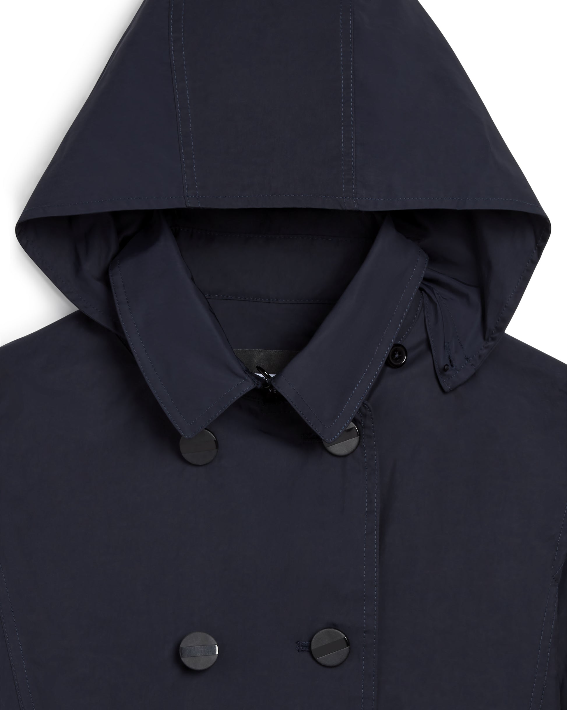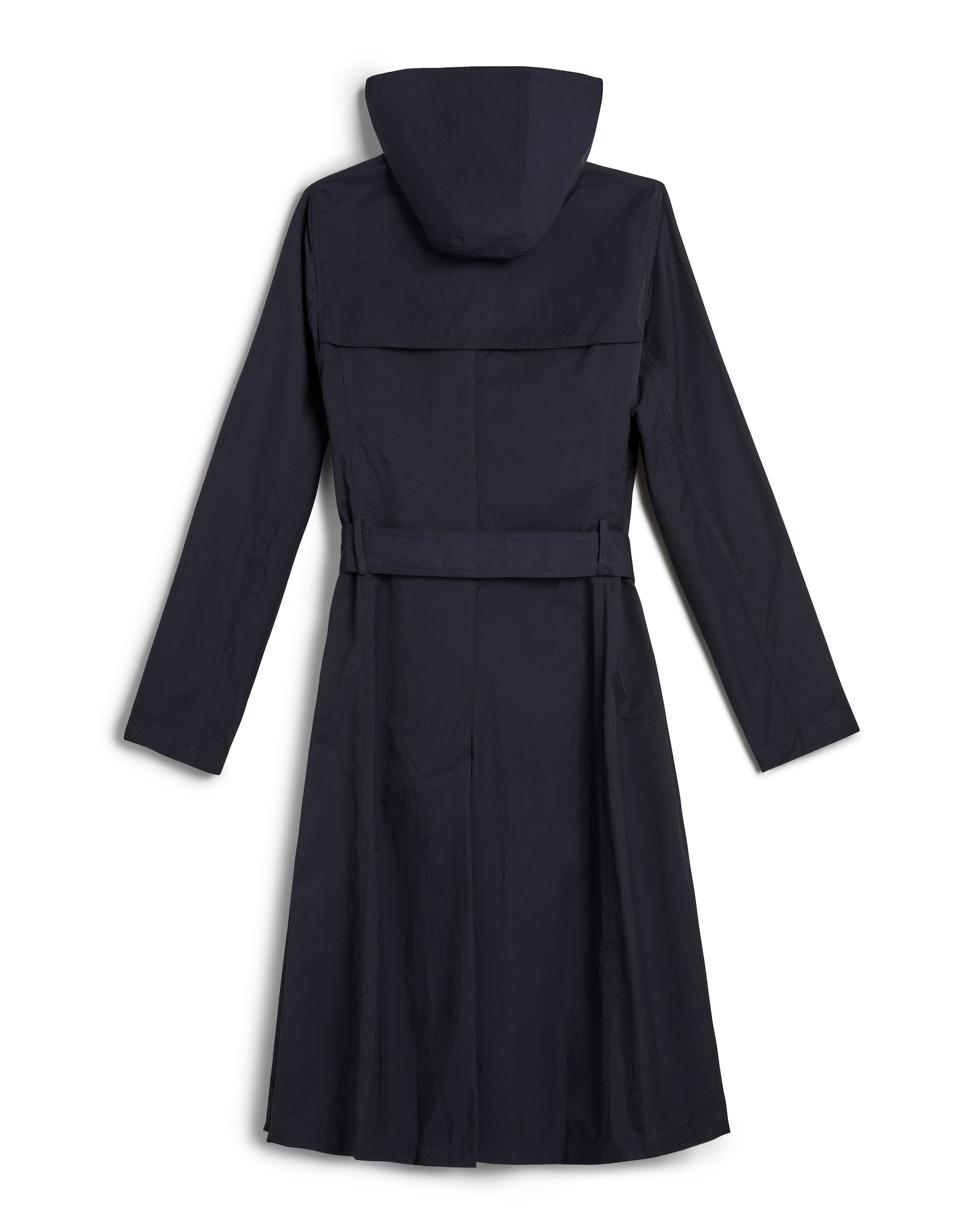 Pray for rain with our stunning techno trench! Finished in a wonderful, textured nylon from Italy and fully water resistant, featuring a detachable hood and belt with a flattering fit thanks to elegant princess seaming on the front and a storm flap at back.